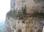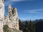 Une aiguille insolite sur la vire supèrieure de Sombardou, au fond le mont Aiguille et le Grand Veymont. La sente est bonne, le troisième et dernier passage stressant est juste derrière.
