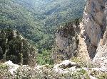 La très large et confortable vire superieure, avec au fond le couloir d'éboulis que l'on redescend, et juste au dessus de Jean-Phi, la sortie de la cheminée par laquelle on a débouché.