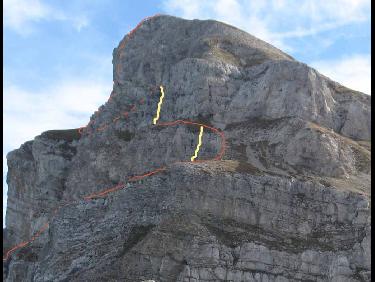 En haut le passage probable de l'itinéraire n°9, au milieu le notre. On voit la zone délitée sous le nez et le monolithe à gauche