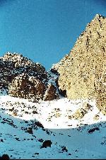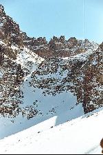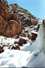 au centre, la cascade vers le Tizi meloul 3875 m, et a droite le couloir de glace ( 600 m, 45°, TD)