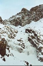 le couloir ouest du biiguinnoussene 3957 m, voie vers le tizi n tadat 3875 m et le refuge du Toubkal