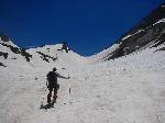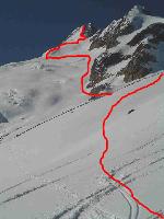 :!: Ne pas sous-estimer le facteur exposition dans cette pente terminale. Une glissade peut vous amener droit sur le plateau supérieur du Glacier du Pré de Bar à 3200 mètres, et en petits morceaux bien évidemment à moins que vous soyez protégé par la Madone...