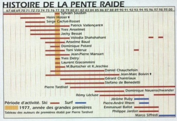 | A. Baud, P. Vallençant, Jean-Marc Boivin, Pierre Tardivel, D. Chauchefoin, Gérard Chantriaux, J-P. Bonfort, V. Shahshahani, reprennent à leur compte cette technique qui se rapproche étroitement de l'alpinisme : aller là où les yeux ont vu en montant à pied, et, redescendre les skis aux pieds... |