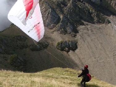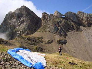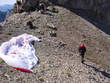 Porte des Aravis. Le décollage sur le pierrier est délicat à préparer pour ne pas déchirer la voile ni couper les suspentes sur les pierres qui pourraient les accrocher. La course de décollage dans le pierrier est par contre facile et sans risque..