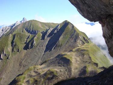 On décolle sur le replat au sommet de la pente d'herbe hyper-raide. A gauche, le Lanfonnet. A droite, le Roc Lancrenaz puis Roche Murriaz.
