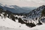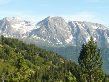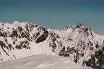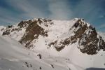 depuis le rocher derrière Chamrousse (donc vus d'un peu plus haut). Une petite caravane plonge depuis le Col de la Botte (au 1er plan) vers celui des Lessines. On distingue bien le Grand Van (qui pointe au centre, au soleil) et le Petit (dôme de neige à droite, à l'ombre)