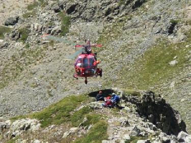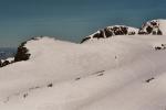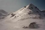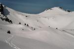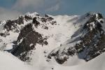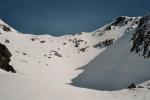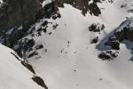 Vue plongeante, depuis l'itinéraire en provenance du Col de la Botte. Les skieurs renonceront finalement au couloir de droite, très redressé, pour la pente un peu moins raide (c'est quand même le passage le plus raide du parcours) à gauche du gros rocher (et moi je ferai pareil !)...