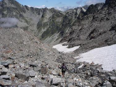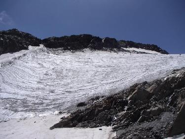on le longe à la descente et on est même dessus..on s'en aperçoit quand les pieds glissent sur la glace à peine recouverte de pierres et qu'on se retrouve les fesses par terre!!