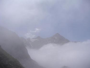 le Rocher Blanc et le glacier émergent à peine du brouillard qui a tout envahi derrière nous