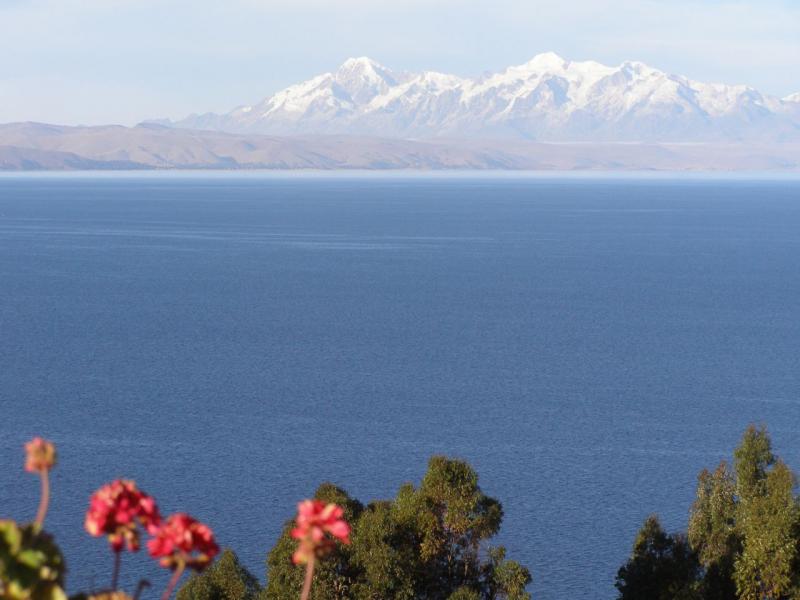 Les eaux bleus du Titicaca et les montanges de la Cordillère.