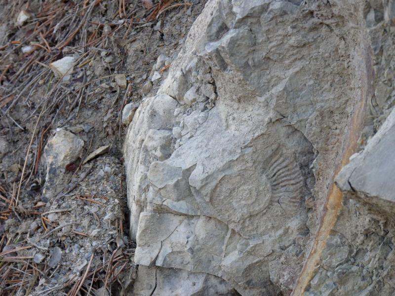 Au bord du sentier dans les lacets sous les pins, une ammonite déjà respectable..