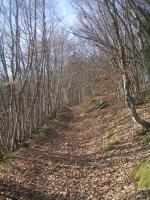 sentier déneigé en sous bois ensoleillé..