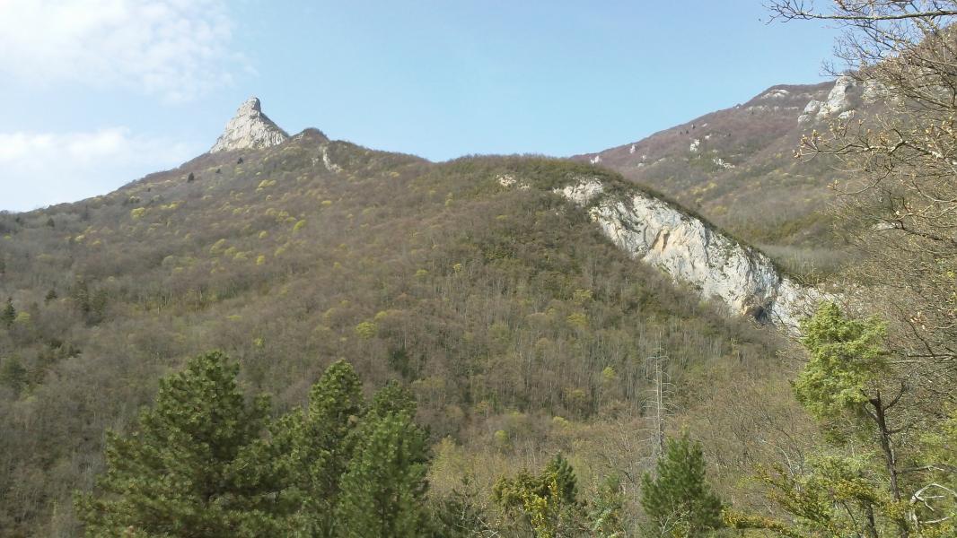 la roche de chanduraz vue du bas. la falaise fait plusieurs dizaines de mètres de haut