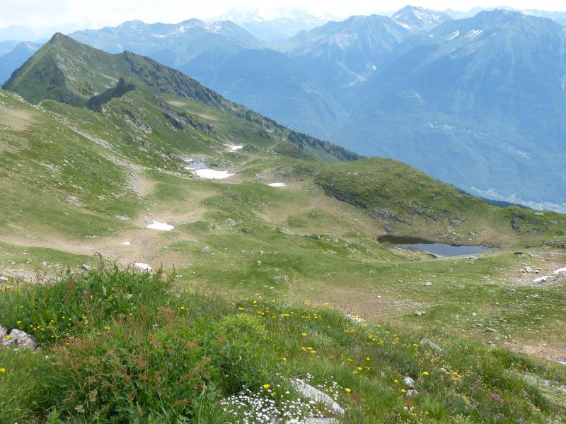 Du sommet, à droite, le Lac Clair, au milieu le Lac de Charvan et à gauche, au bout de la crête, la dent du Corbeau