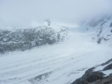 Le refuge des Conscrits est là quelque part dans les rochers, et les dômes de Miage quelque part dans le brouillard