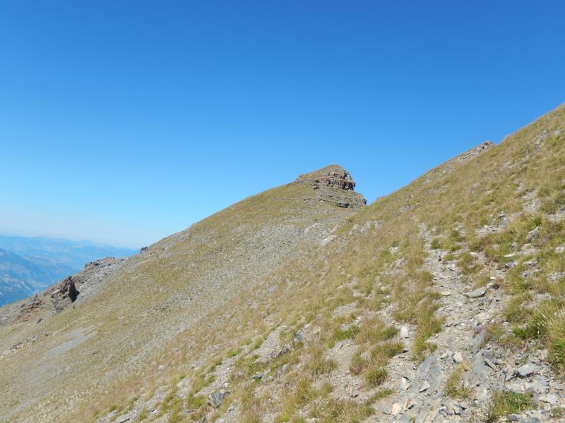 Une bonne trace versant Ubaye mène en douceur au sommet de la Tête de la Vieille, au milieu de la photo.
