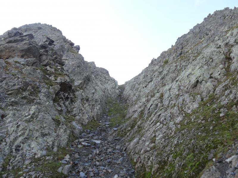 Le couloir de montée permettant de prendre pied sur l'épaule menant au sommet: casque indispensable si groupe!!