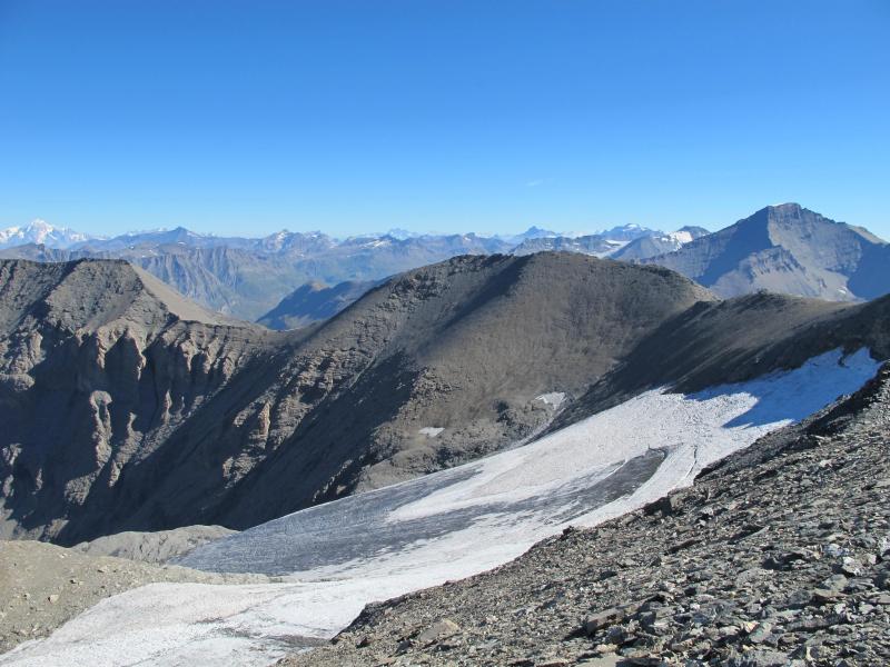 Au-dessus du glacier du Lamet, portio de l'arête entre la pointe et le pas du Chapeau, la pointe de la Haie et le pas du Lamet (de gauche à droite). À droite au second plan, pointe de Charbonnel. Tout au fond à droite, Grand Combin, Grivola, Grand Paradis.