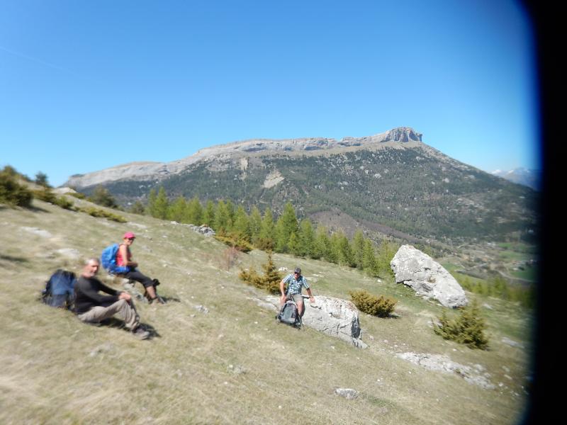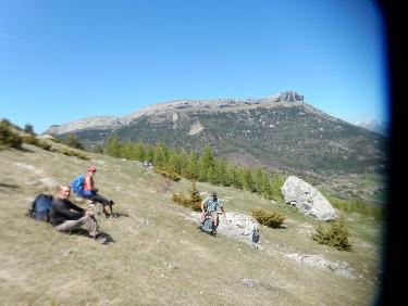 Un peu de repos près du point 1461, avec Céüse en toile de fond, après la montée dans les ravines.