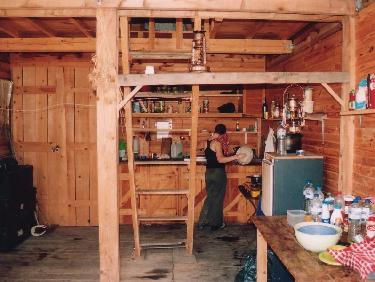 Un bien beau refuge, bien équipé (même si il manque le poêle): table, bancs, réchaud, étagères, ustensiles de cuisine et pour couper le bois, évier, ...