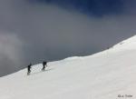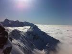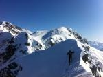 Montée par les pistes au Col du Pouta au milieu des touristes, pas trop nombreux et un pisteur casse-c*$@lle parce que j'étais trente centimètres trop proche de la piste. N'importe quoi! Au col, on met tout sur le sacet l'on chausse les crampons, sous le regard interrogatif des skieurs. L'arête nous envoie en quelques minutes bien loin de l'ambiance station. Franchement dépaysant. Un Petit moment magique aujourd'hui car nous sommes envahis, assez rapidement, par une sacrée belle mer de nuages. L'ambiance est Cho Oyu parait-il!