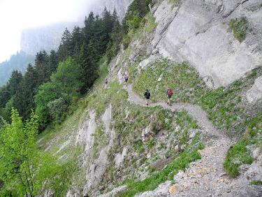 La belle descente par le Pas de la Clé, seul passage éventuellement un peu délicat du jour, ne pose aucun problème, car tout est bien sec. Arrivés en bas, le panneau qui en interdit l’accès en hiver et par fortes pluies est toujours là…