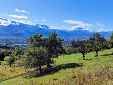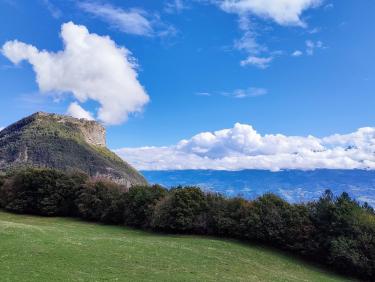 Décidés à ne pas prendre la voiture, c'est de la maison que nous partons pour le tour du Rachais, non sans nous arrêter à Grenoble quérir les délicieuses quiches de l'Esplanade. Compte tenu des pluies diluviennes de la nuit, nous optons pour une montée sèche par l’asphalte des ruelles de Corenc afin d'éviter les sentiers trop humides. La petite route monte à travers les maisons somptueuses des beaux quartiers de la ville. Les nuages, encore nombreux ce matin sur le sommet, se dissipent lentement pour disparaître en même temps que nous atteignons le sommet nord du Rachais plus connu sous le nom de Fort Quichat. Après une courte pause, il faut revenir sur nos pas vers le sud et traverser les splendides prairies suspendues à cheval sur la crête. Malgré la proximité immédiate de Grenoble, la solitude est totale. L'éclatant soleil nous impose une longue pause face au vaste panorama que nous offre le sillon alpin. Les sommets blanchis de Belledonne se cachent derrière une multitude de cumulus massés comme des moutons près du relief, dans ces conditions le pique-nique est une délectation.