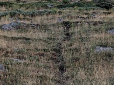 La sente traverse l'atterrissage, facile de ne pas se tromper, c'est tout droit dans le pentu. Plus on monte, plus c'est raide. Une sorte de moitié d'un kilomètre vertical. Avec en plus des murettes à gravir. Heureusement on peut souvent les contourner.