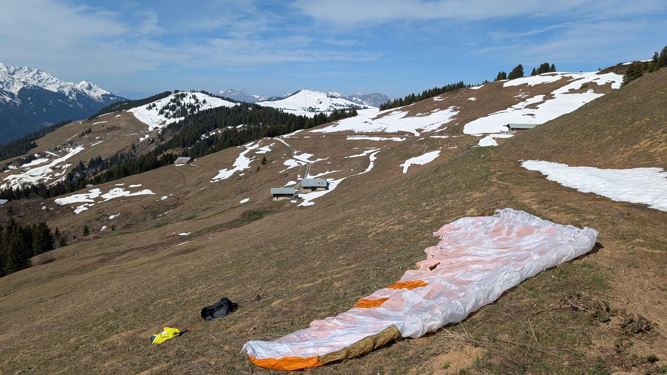 Je descends direct au déco de cet automne où c'est une alternance de cul ou de bon face. Bien sûr une fois prête, la voile se replie sur elle même. Je gonfle et zut une grosse herbe est emmêlée dans les suspentes hautes. Je l'enlève et cette fois je gonfle face voile, nickel. C'est parti avec devant un thermique onctueux qui m'emmène à 2200m. Un petit tour plus loin que le mont, c'est moins bien et plus turbulent. Je file en vallée et me pose tranquillement dans les pentes au dessus d'Hauteluce.