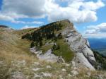 Prendre une trace à peine marquée montant à gauche dans le sous-bois. On tombe très vite sur une petite ravine : la remonter et sortir ainsi rapidement du sous-bois. En faisant d'abord un crochet à droite, passer d'une clairière à l'autre : on se trouve progressivement sur une pente tout à fait dégagée. Rejoindre à gauche la corniche vers 1 600 m.